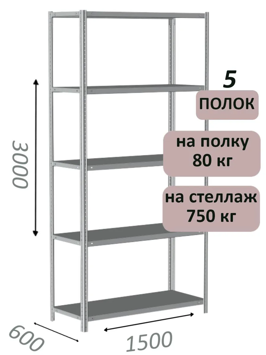 Стеллаж металлический полочный МС-750 3000х1500х600, 5 полок, светло-серый