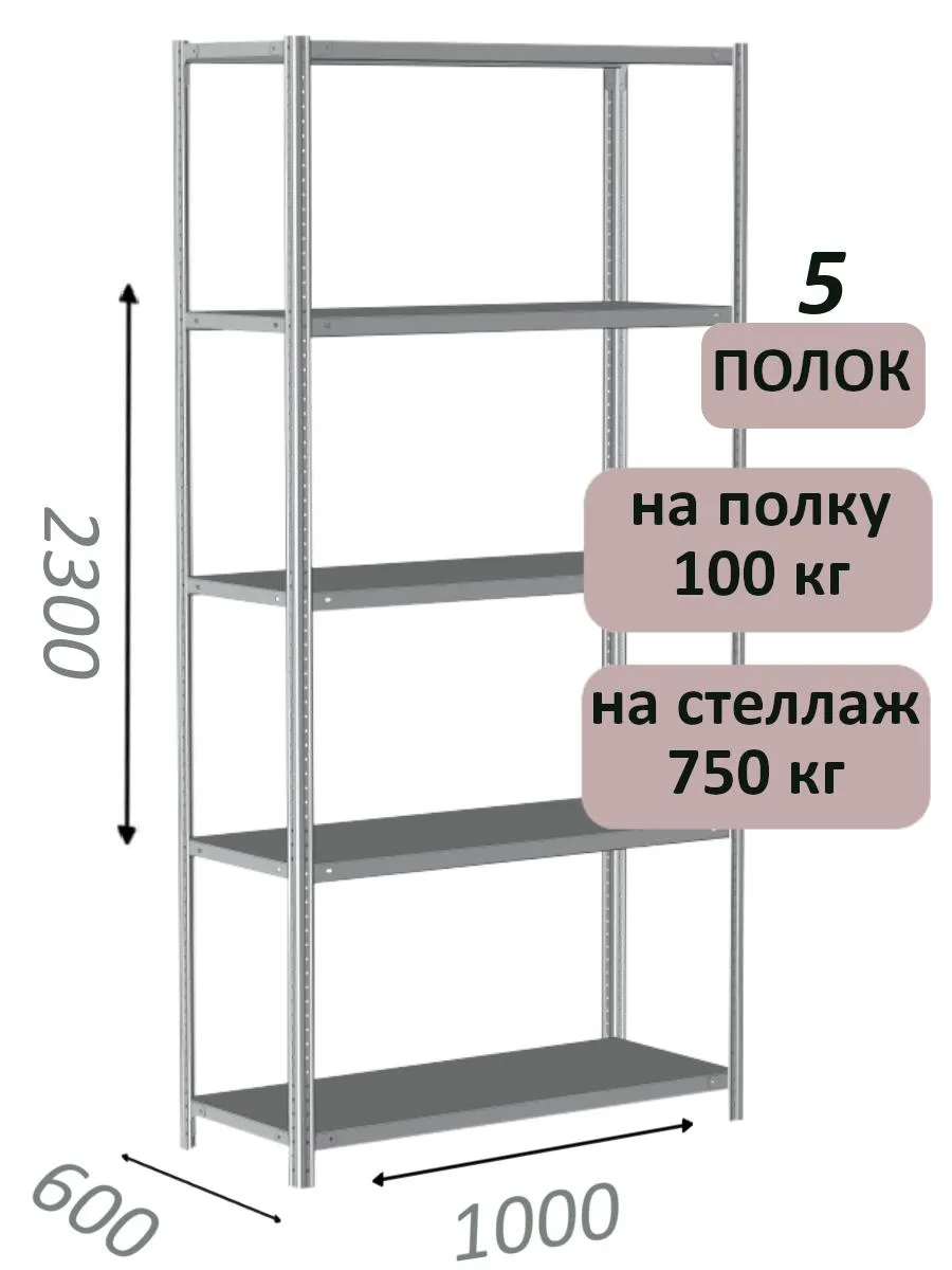 Стеллаж металлический полочный МС 2300х1000х600, 5 полок, 100 кг на полку, светло-серый