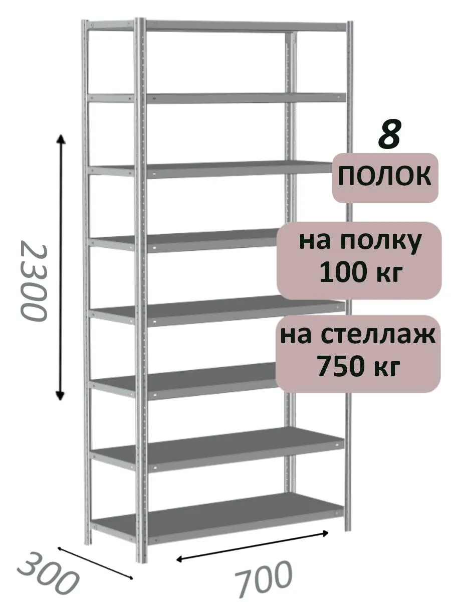 Стеллаж металлический полочный МС 2300х700х300, 8 полок, 100 кг на полку, светло-серый