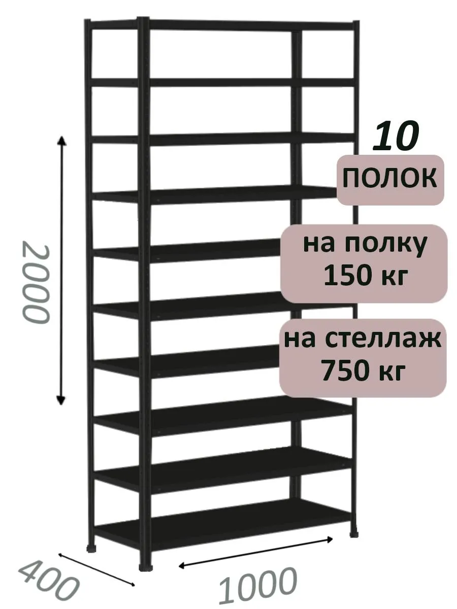 Стеллаж МС 2000х1000х400, 10 полок, чёрный
