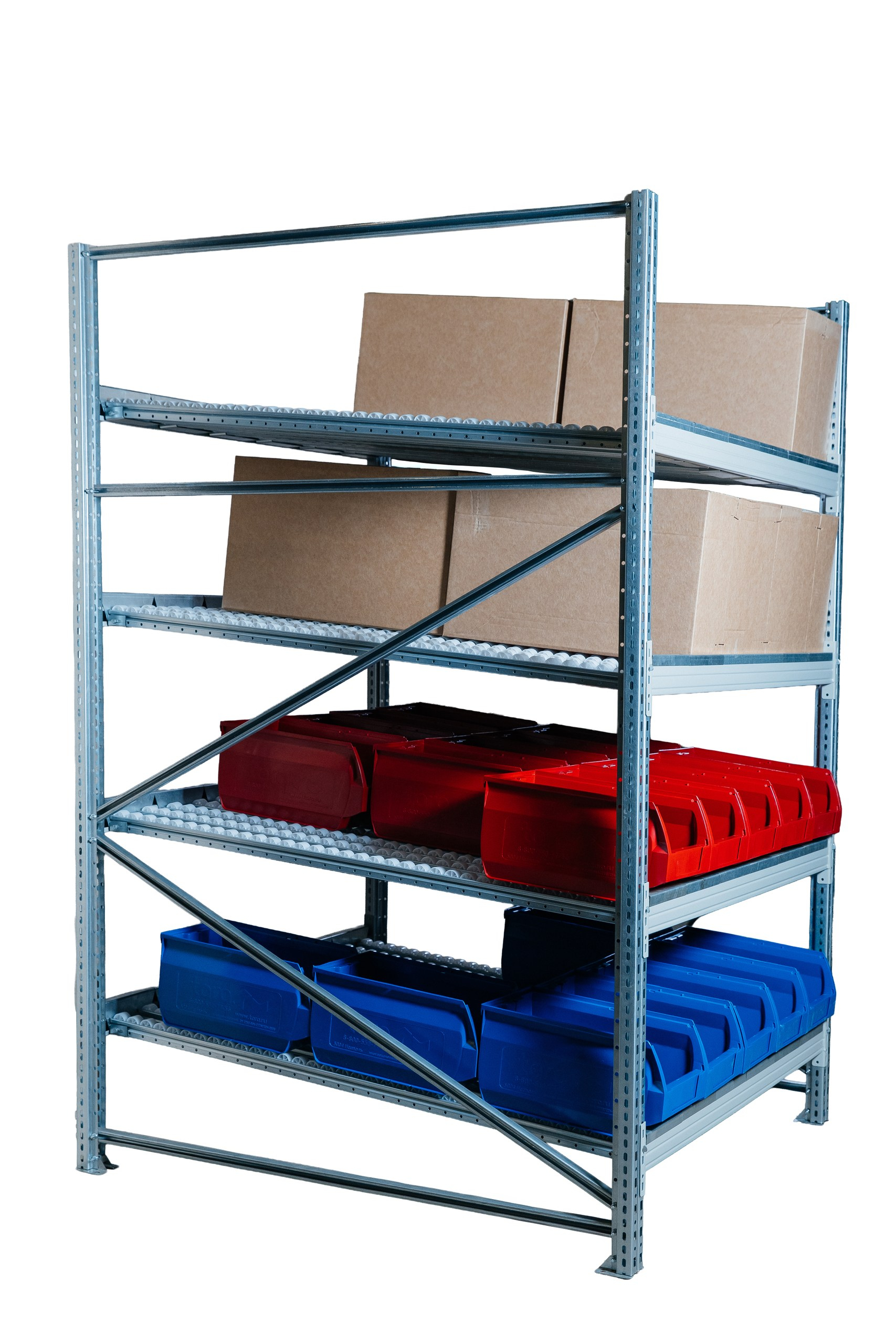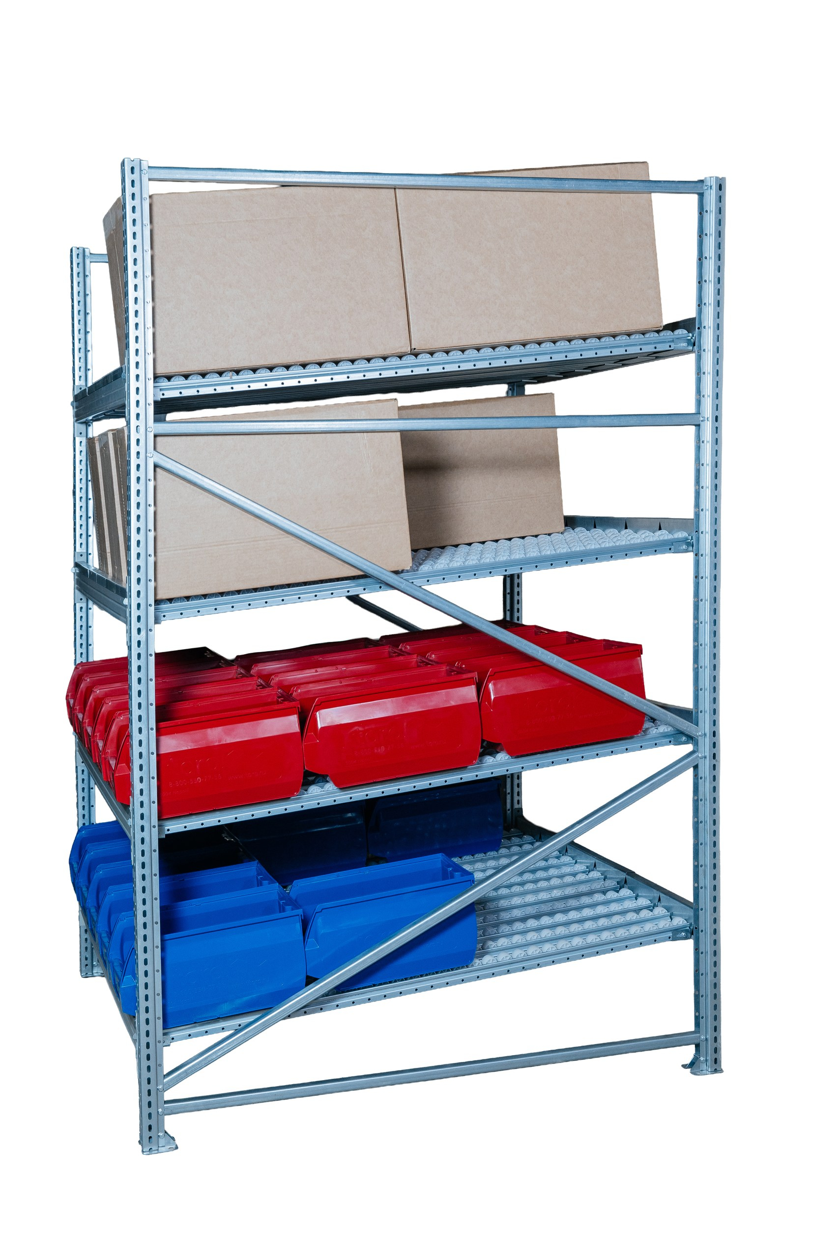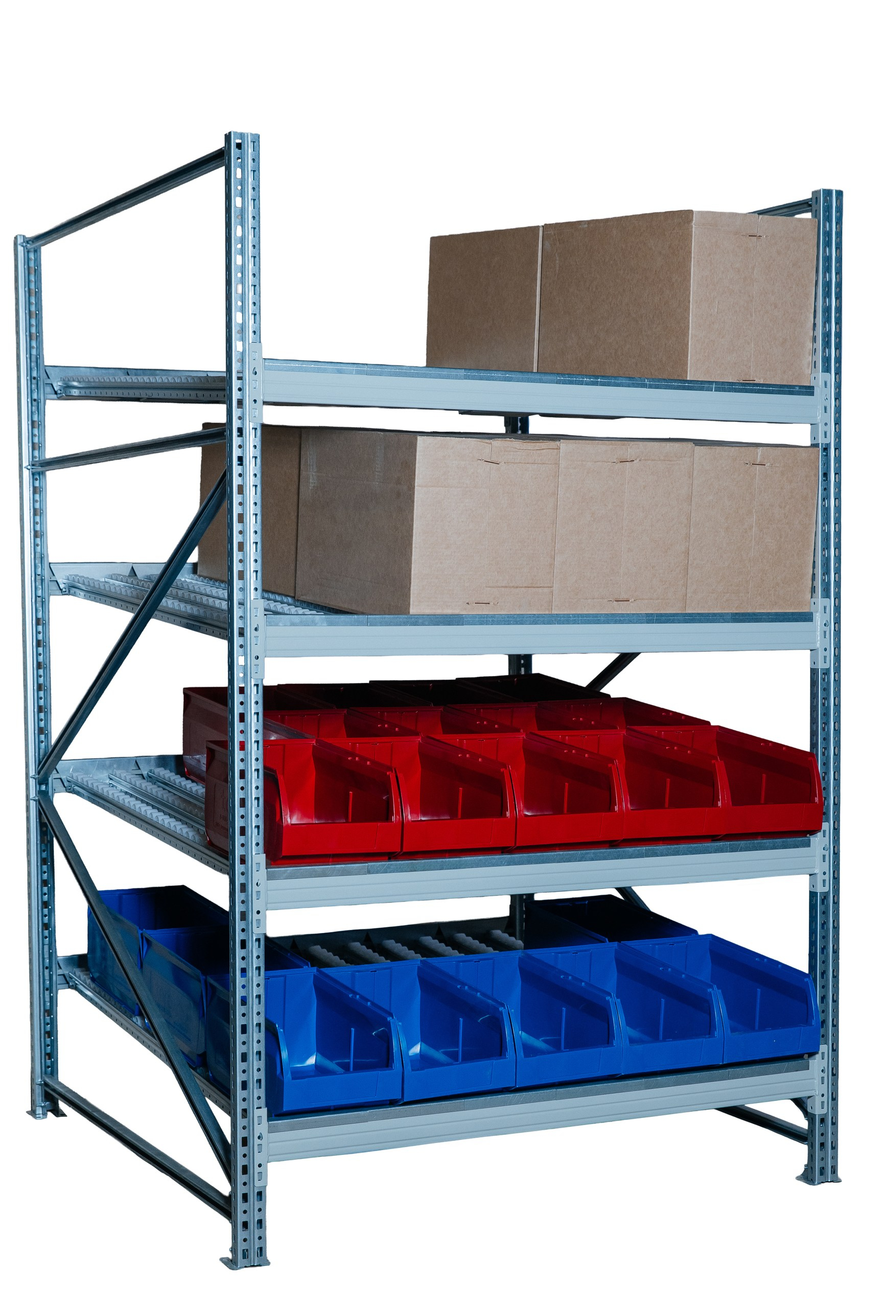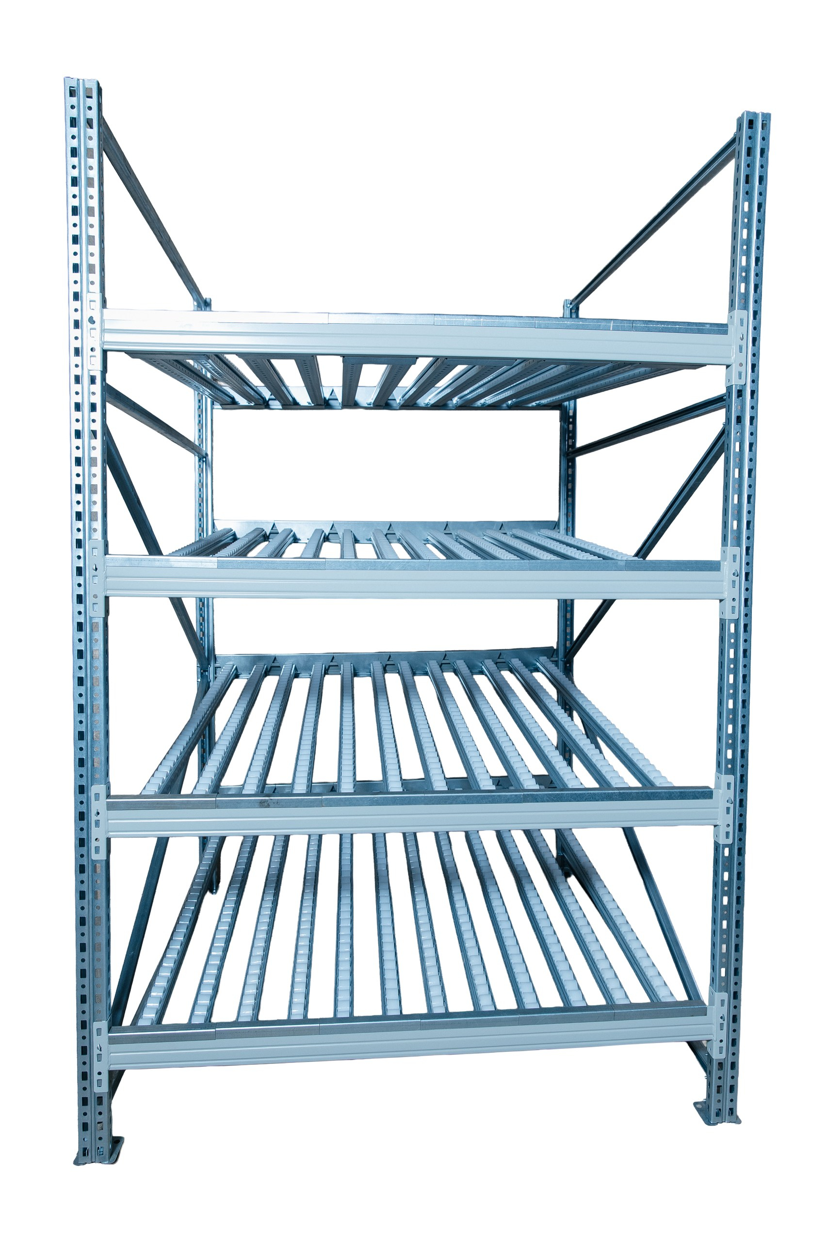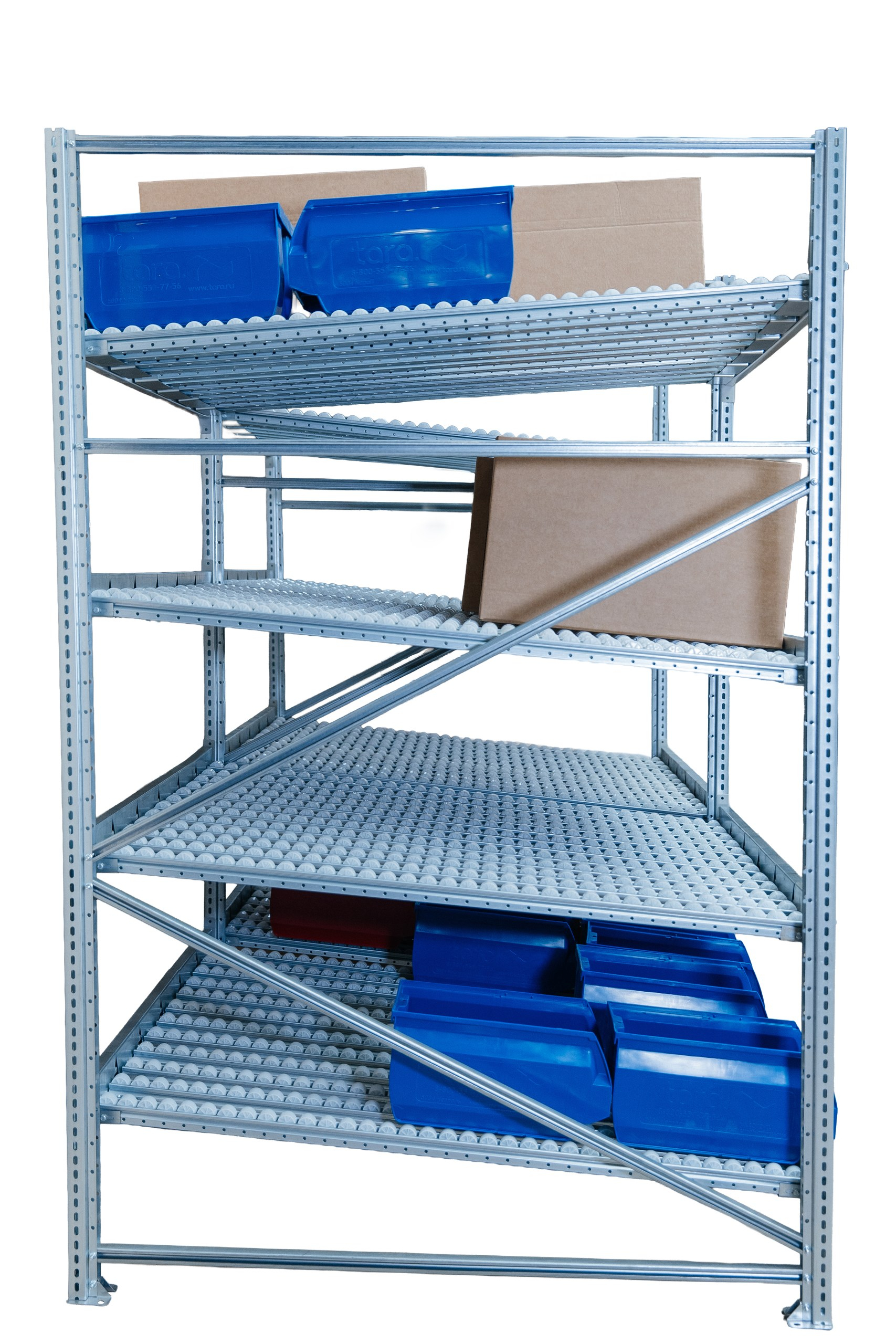 Гравитационный стеллаж с роликовыми полками 1600х900х1300, 4 яруса
