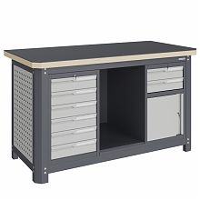 Верстак серии MECHANIC: MCN 1552.S677-2F состоит из столешницы шириной 1493 мм, рамы верстака, состоящей из опор, перемычек, боковых перфопанелей, малых модулей S6, S7, двойного экрана с кронштейнами и комплекта освещения.