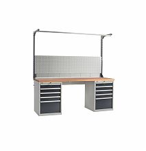 Металлические элементы верстаков окрашены эпоксидной порошковой краской, устойчивой к механическим воздействиям и агрессивным жидкостям. Ящики, дверцы тумб и стойки экрана – цвет антрацитово-серый RAL 7016, остальные элементы – цвет серый RAL 7038.