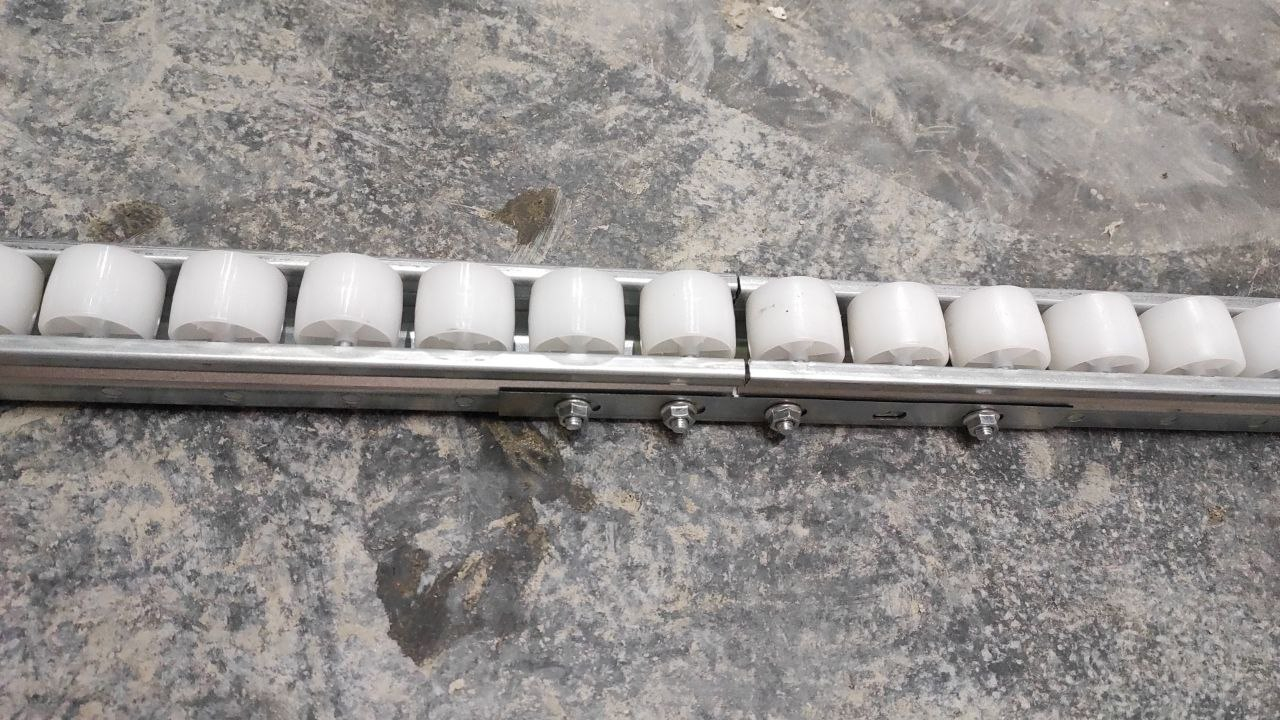 В рамках проекта был спроектирован и испытан специальный соединитель роликовых направляющих. Стандартная длина ролика составляет 4000 мм, однако при монтаже на стеллажи различной ширины неизбежно образуются остатки материала. Разработанное решение позволяет использовать эти отрезки в проекте без потери несущей способности яруса.